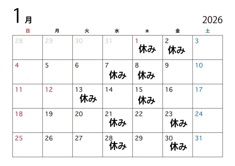 1月のお休みは 1.2.7.8.13.15.21.23.28.30日 で頂いています。